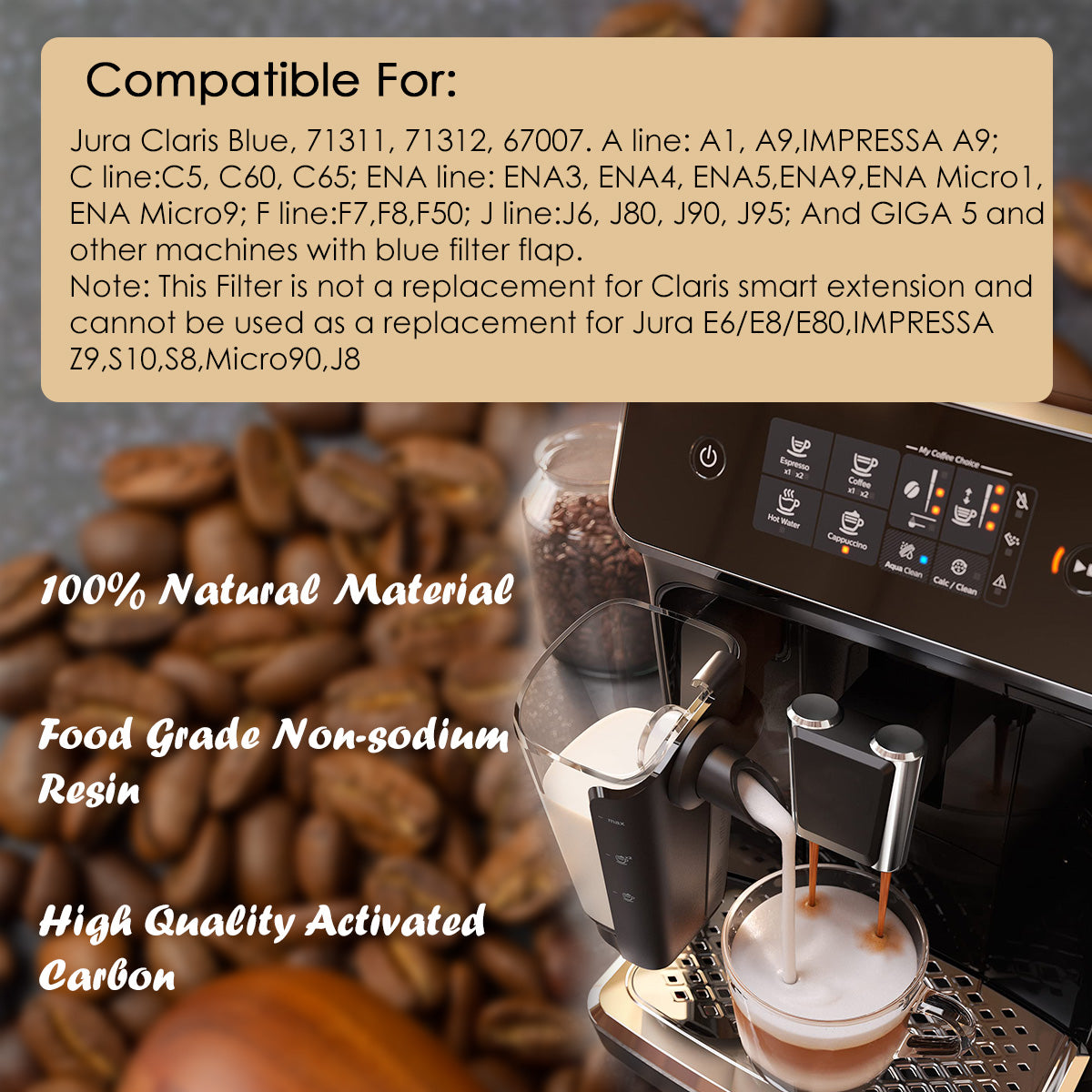 Replacement for models: Jura Claris Blue, 71311, 71312, 67007. A line: A1, A9,IMPRESSA A9; C line:C5, C60, C65; ENA line: ENA3, ENA4, ENA5,ENA9,ENA Micro1, ENA Micro9; F line:F7,F8,F50; J line:J6, J80, J90, J95; And GIGA 5 and other machines with blue filter flap.Note: This Filter is not a replacement for Claris smart extension and cannot be used as a replacement for Jura E6/E8/E80,IMPRESSA Z9,S10,S8,Micro90,J8